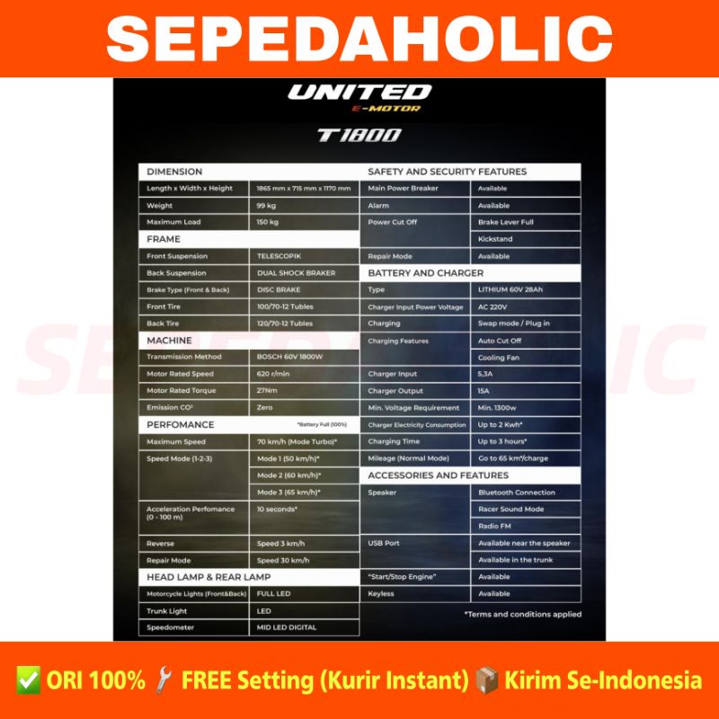 - Produk ini tidak sedang Flash Sale, tidak semua Seller suka Flash Sale, saya rasa ini bukan kekurangan, Jika Anda anggap Harga Rp. 29.500.000,00 itu murah untuk Sepeda Motor Listrik UNITED T 1800 E Motor Electric Bike Motorcycle T1800 ya ambil saja